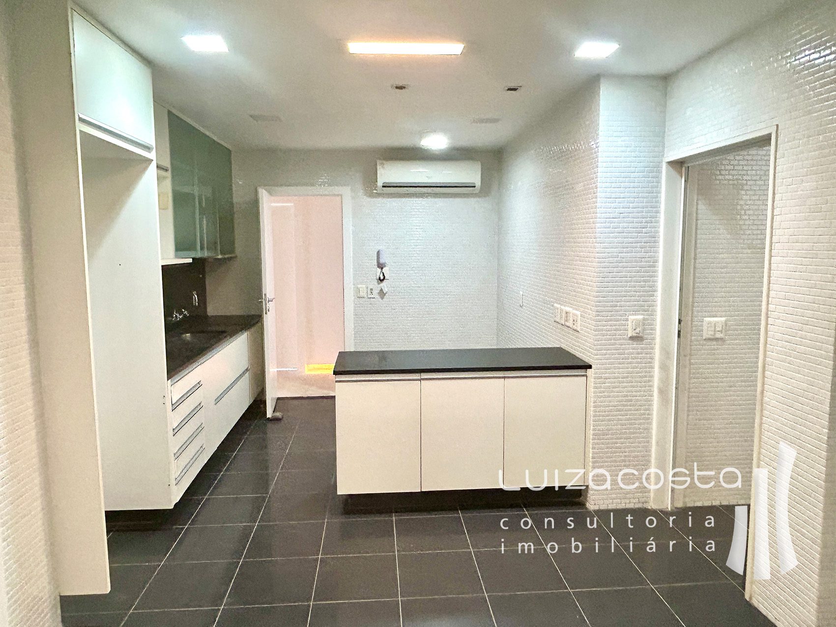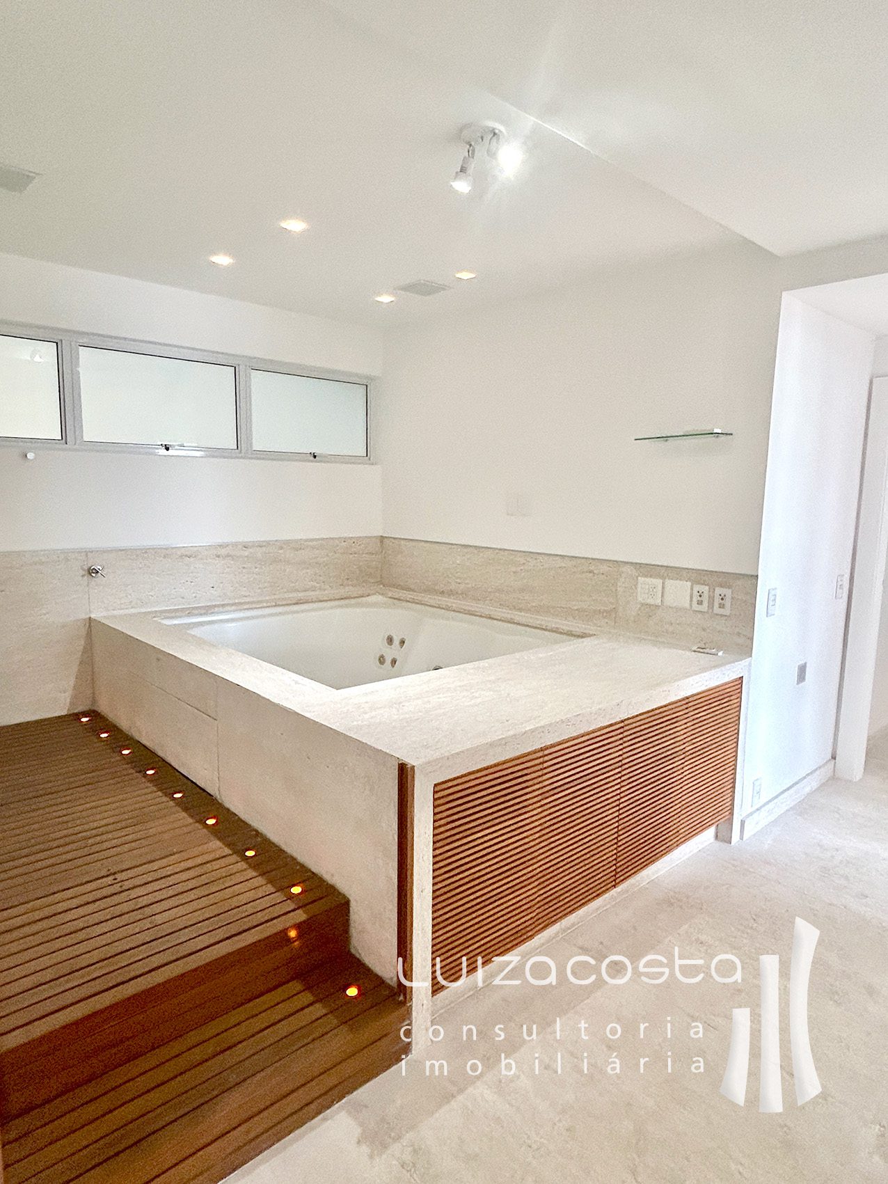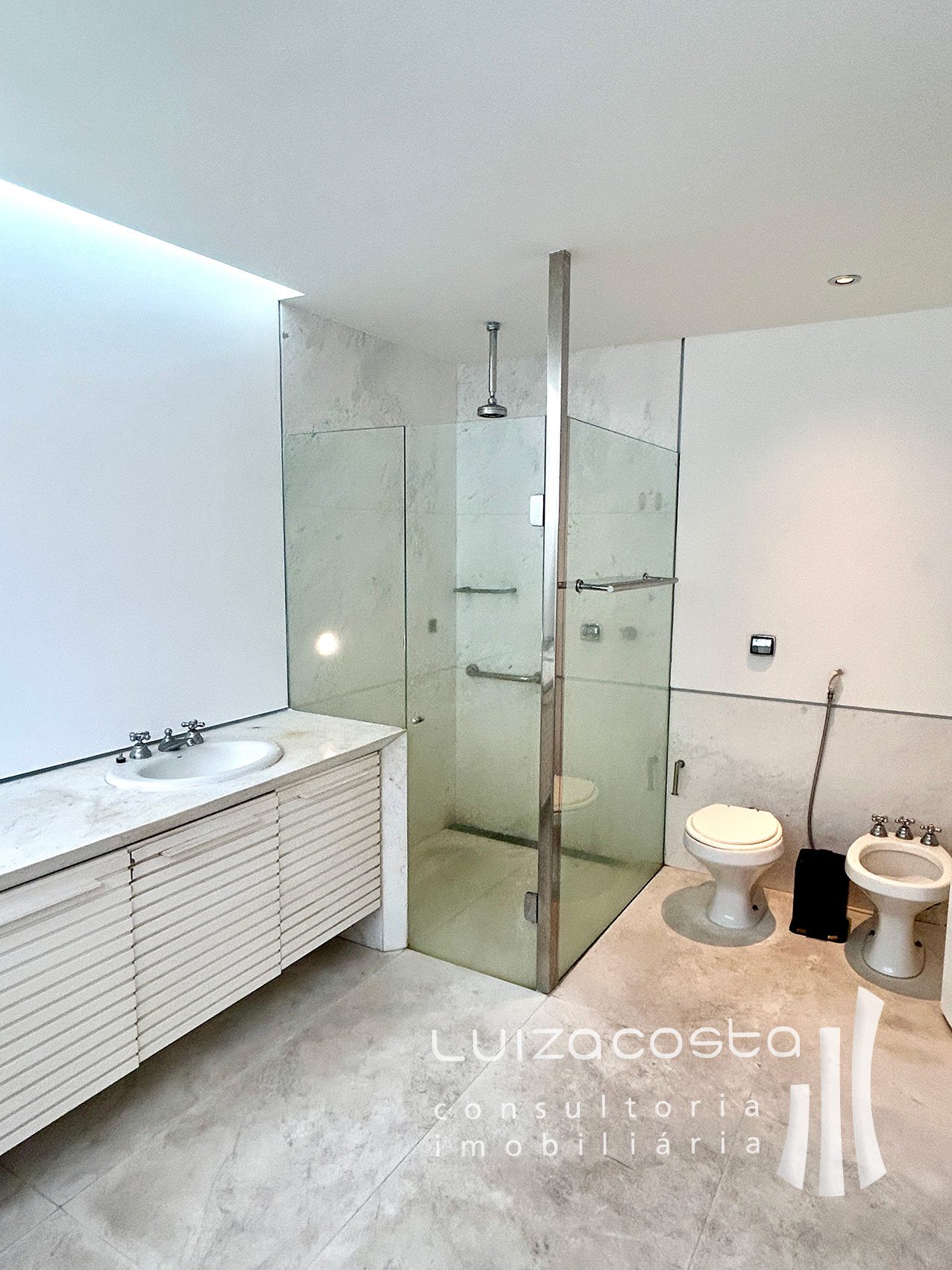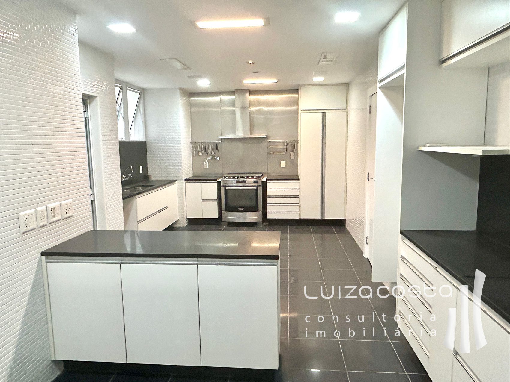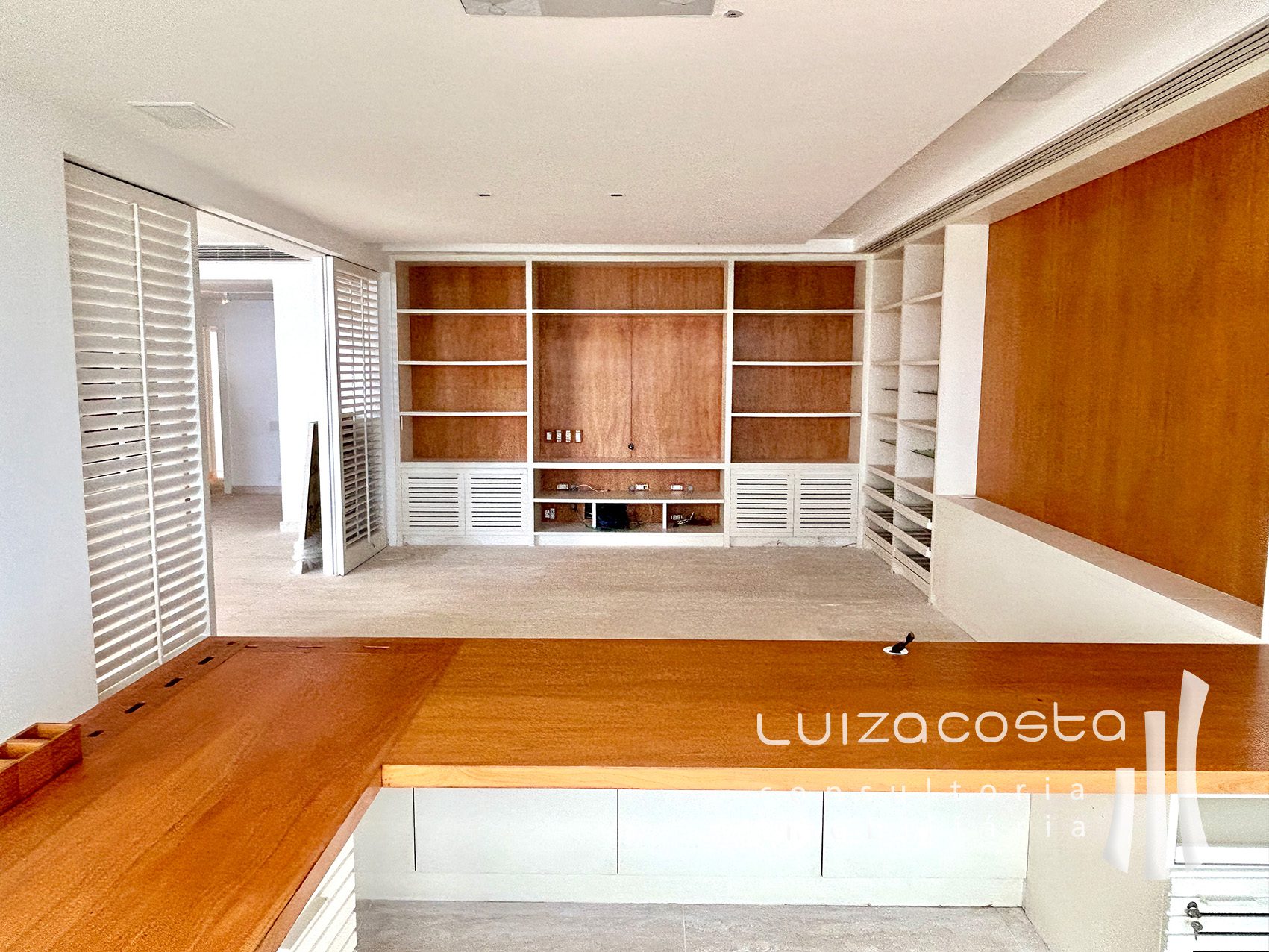 433 m2. Hall de entrada. Living com 90 m2 com piso em travertino romano, sala de jantar, escritório, lavabo, jacuzzi e sauna, 4 quartos com armários sendo 3 suítes – a principal com ótimo closet, copa e cozinha planejada com armários, ampla lavanderia, duas dependências, banheiro de serviço. Prédio com portaria 24h, segurança, salão de festas, maravilhosa sala de ginástica, piscina com raia de natação e sauna. 4 vagas na escritura. Andar alto, todo reformado, vistão espetacular!